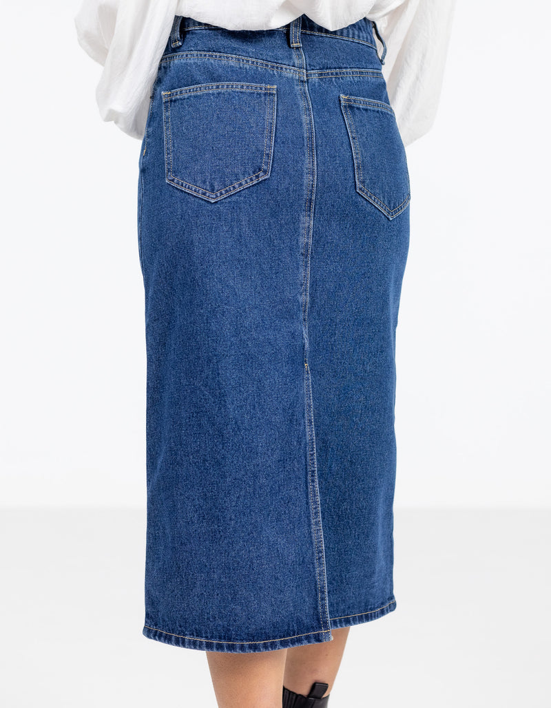 Flynn Non-Stretch Denim Midi Skirt in Dark Blue