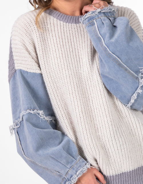 Walnut Denim Sleeve Knit Jumper in White/Grey/Blue