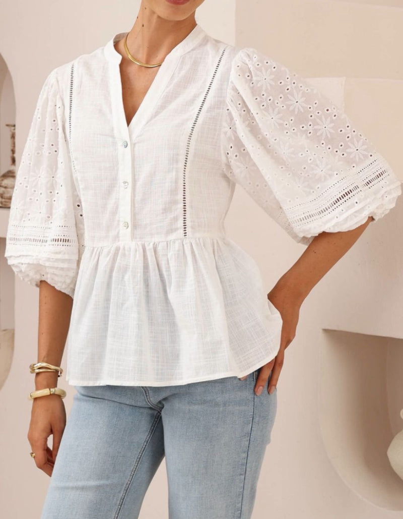Camille V Neck Broderie Anglaise Sleeve Top in White