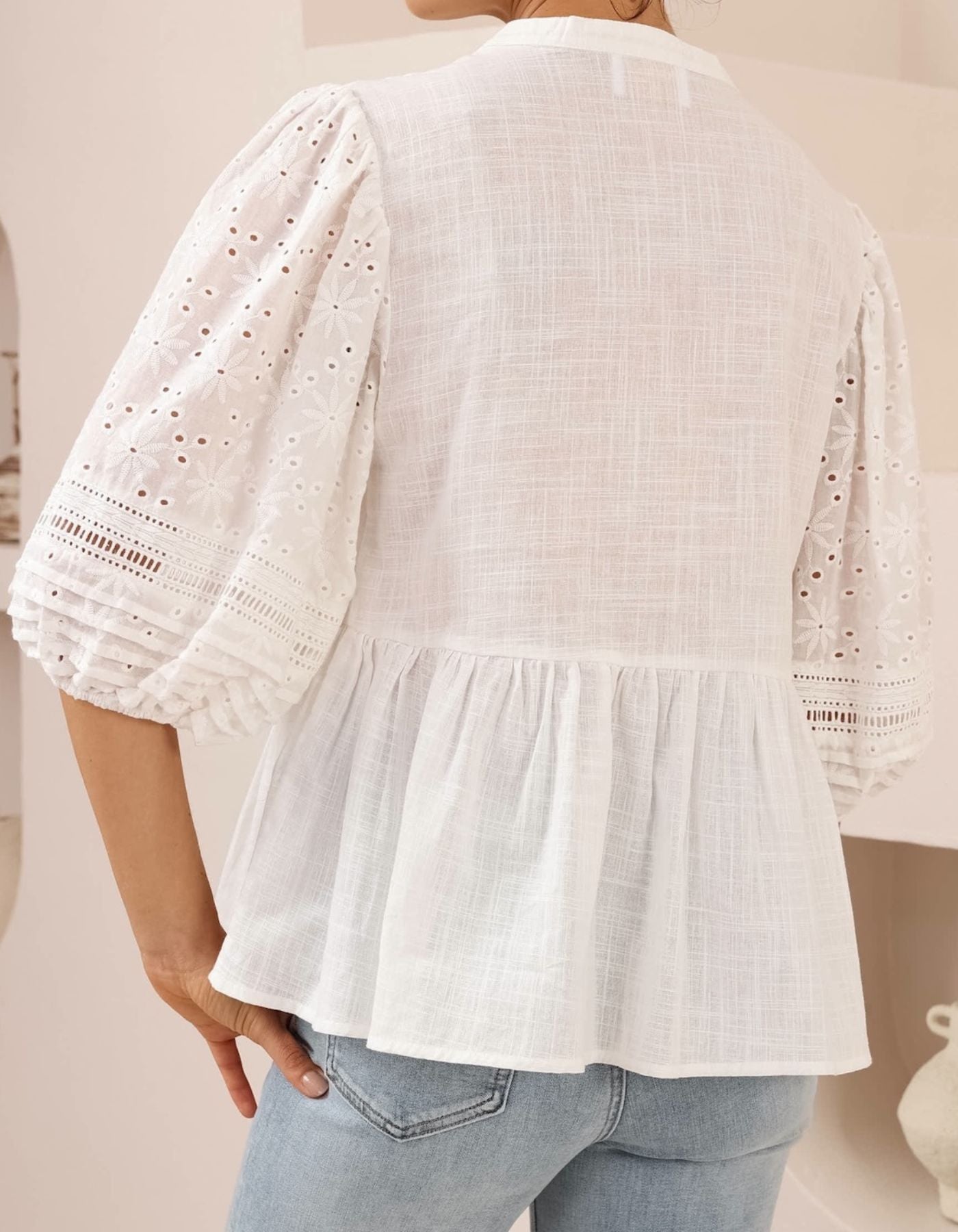 Bring a touch of romance to your everyday style with the Camille V Neck Broderie Anglaise Sleeve Top in White. This charming blouse pairs airy cotton with intricate broderie anglaise puff sleeves, finished with delicate lace inserts for an artisanal feel. The softly gathered peplum hem adds a feminine silhouette, while the flattering V neckline makes it an easy piece to dress up or down. Lightweight and breathable, Camille is your go-to for sunny days and sweet layering moments.